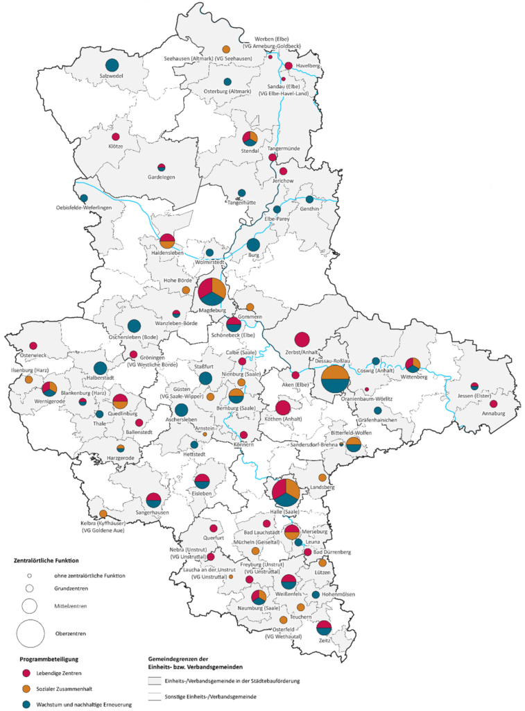 Aktuell werden 76 Kommunen in den Programmen „Lebendige Zentren“, „Sozialer Zusammenhalt“ und „Wachstum und nachhaltige Erneuerung“ der Städtebauförderung im Land Sachsen-Anhalt gefördert. Darunter sind zehn Städte und Gemeinden, die Mitglied einer Verbandsgemeinde sind.